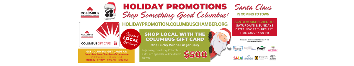 The holiday season is approaching fast, and we're excited to ask for your support in our annual holiday promotions! Santa's House and the new Columbus Gift Card are community-driven initiatives by the Columbus Area Chamber of Commerce designed to celebrate our business community, continue cherished traditions, and encourage shopping local during this special time of year.